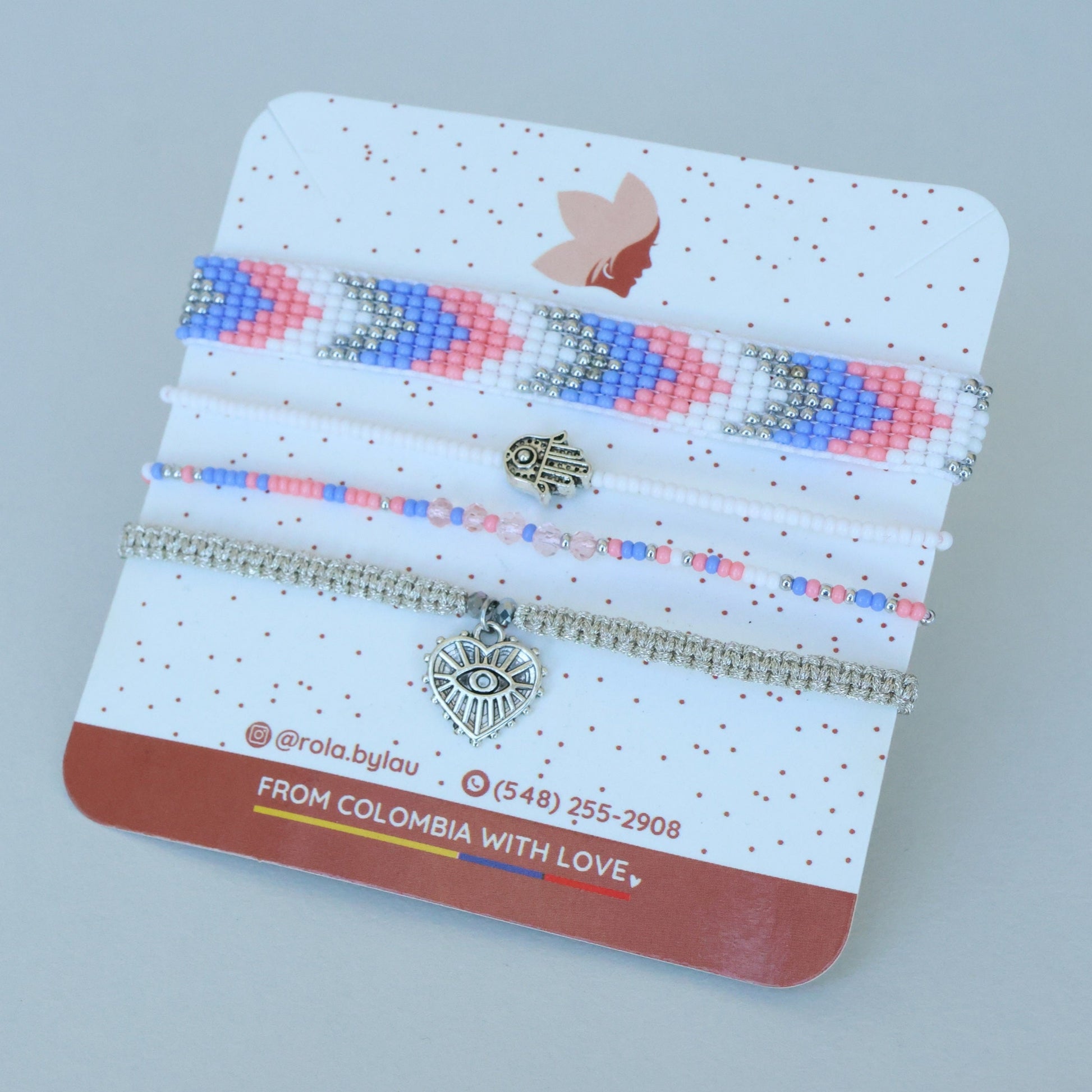 Bohemian-style beaded set of four bracelets in white, with a peachy and azure blue arrow pattern, handwoven with glass seed beads. Adjustable for a perfect fit and adorned with silver charms. It’s perfect for casual wear and a lovely gift for women and girls.