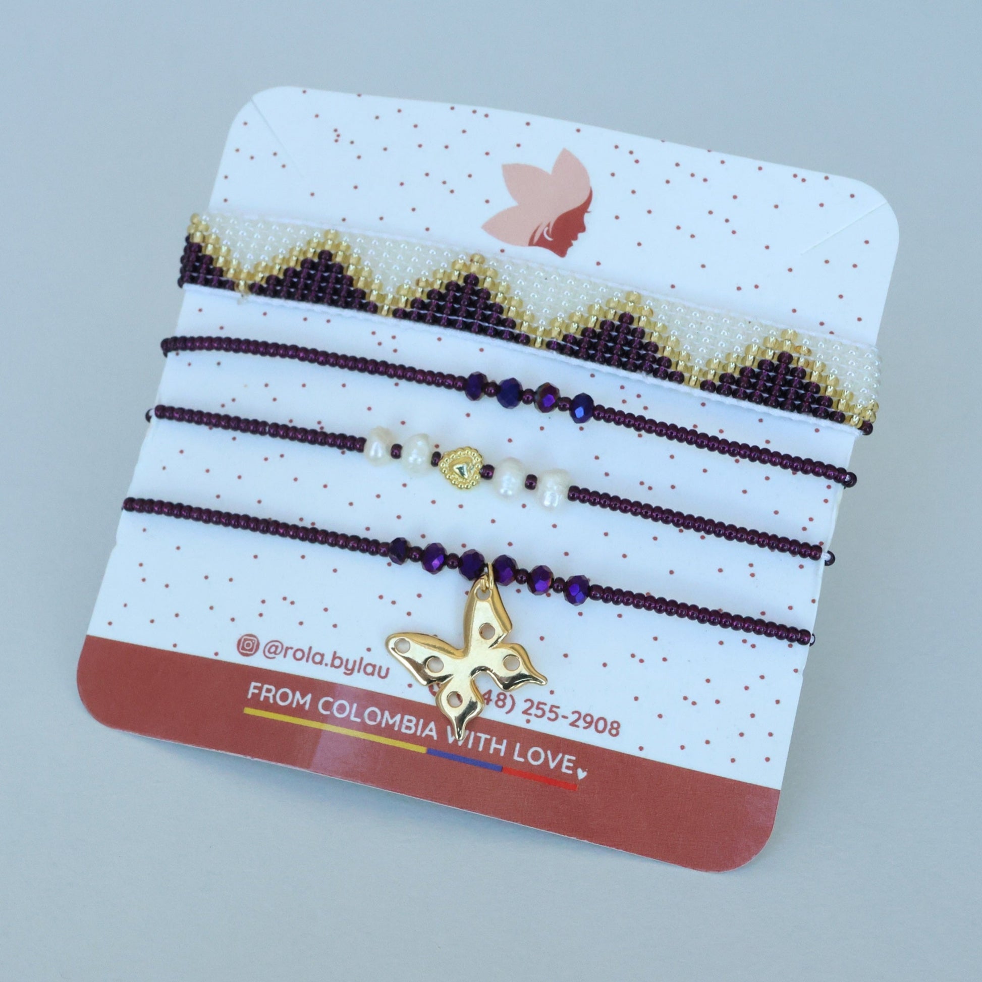 Bohemian-style beaded set of four bracelets in sangria colour, with a white triangle pattern, handwoven with glass seed beads and fresh pearls. Adjustable for a perfect fit and adorned with golden charms. It’s perfect for casual wear and a lovely gift for women and girls.
